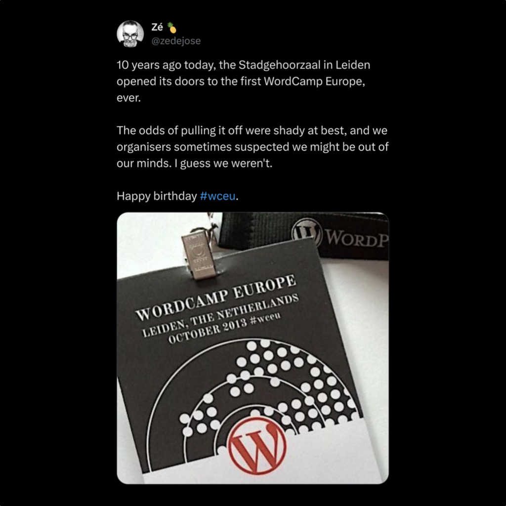 Blast from the past. I wouldn’t post about WordPress here if it wasn’t to honour Zé’s determining role in the genesis of this cross-cultural open source community event and the life he changed by giving an insecure Gen Xer a heartfelt hug and a sense of belonging. I don’t belong to WordPress today but Zé absolutely belongs into its official chronicles.